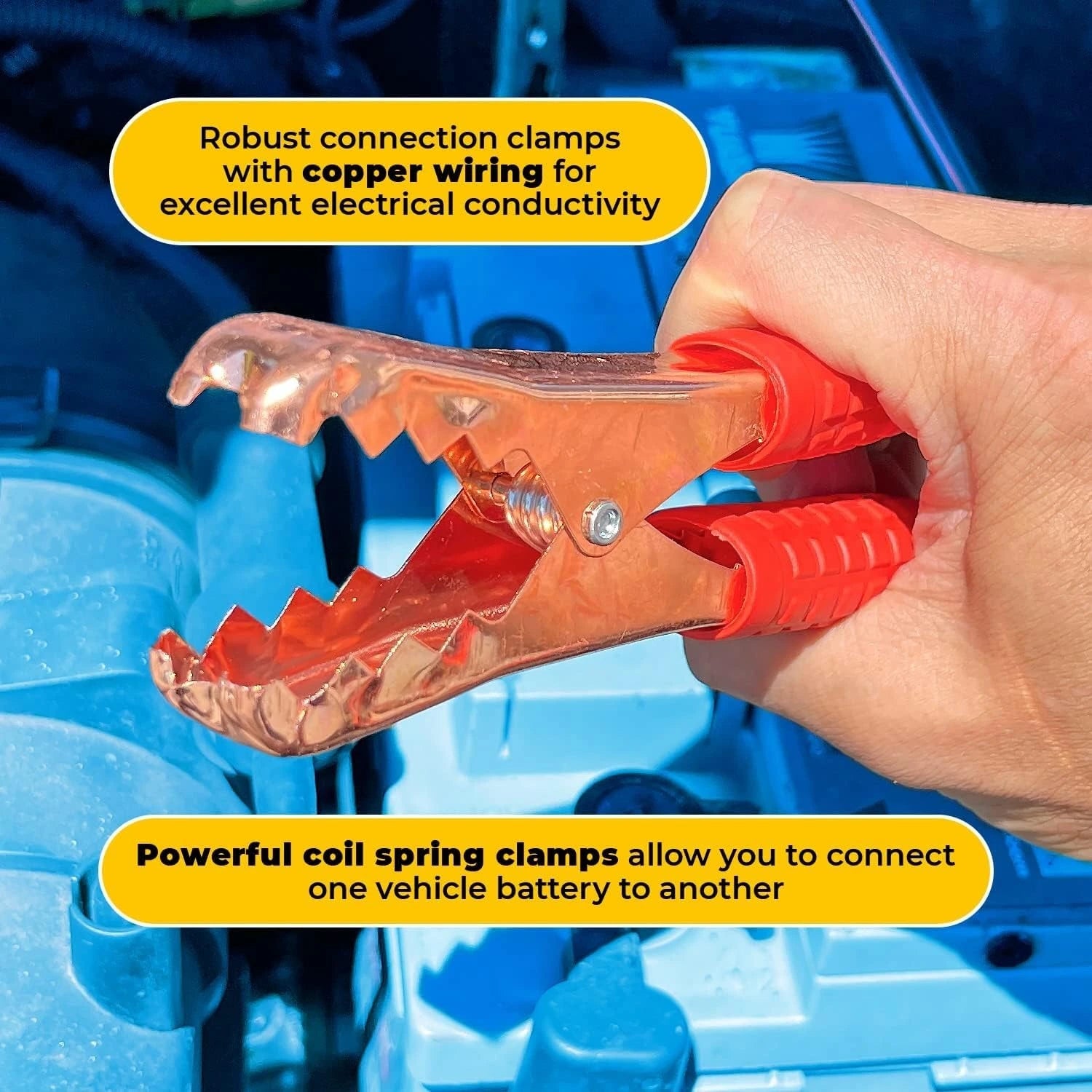 The longer cable length allows two cars to stand at a safe distance while jump-starting.